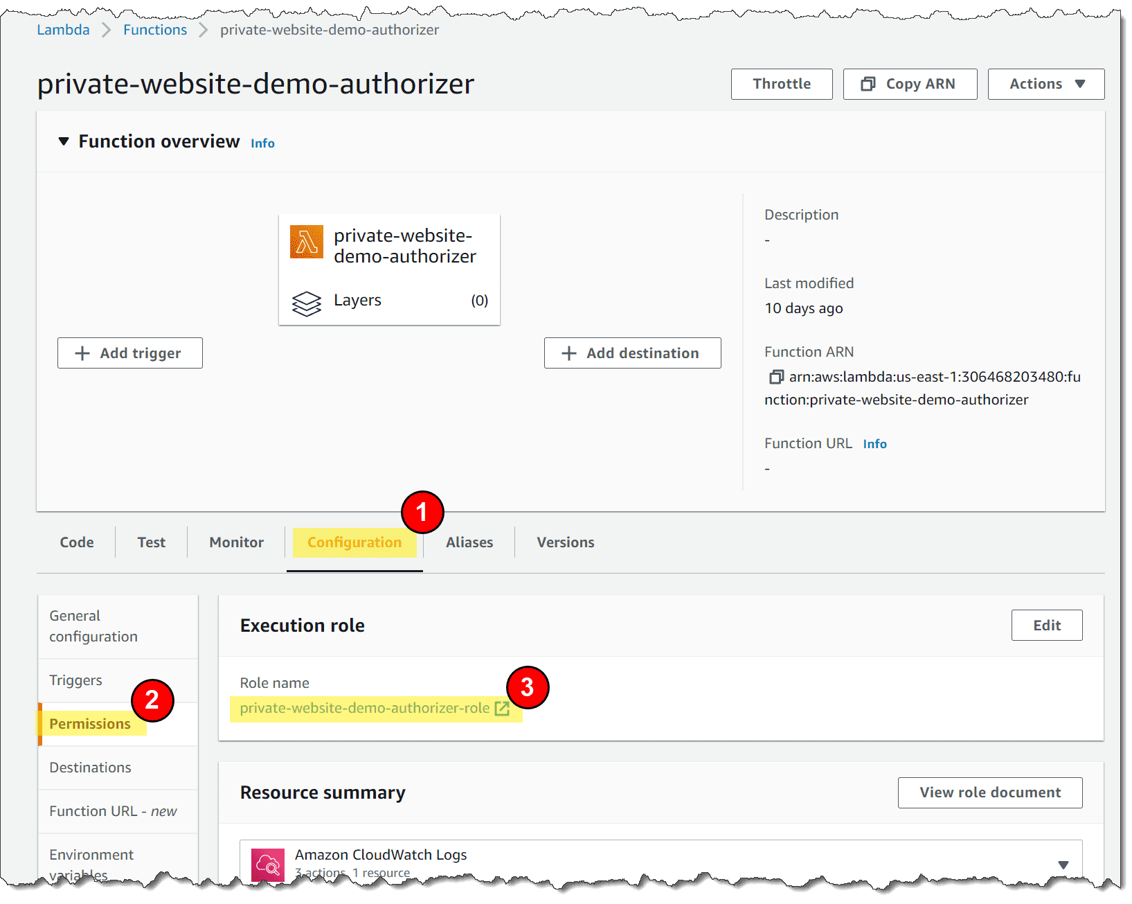 - Go to the Function Configuration tab at https://us-east-1.console.aws.amazon.com/lambda/home?region=us-east-1#/functions/private-website-demo-authorizer?tab=configure