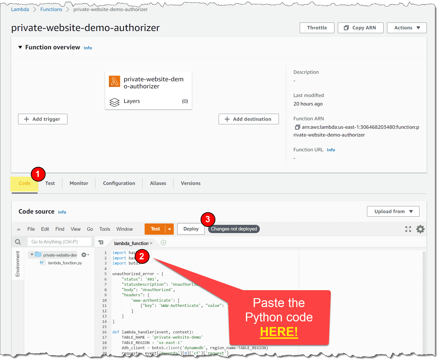 - Navigate to the Function overview page at https://us-east-1.console.aws.amazon.com/lambda/home?region=us-east-1#/functions/private-website-demo-authorizer?tab=code