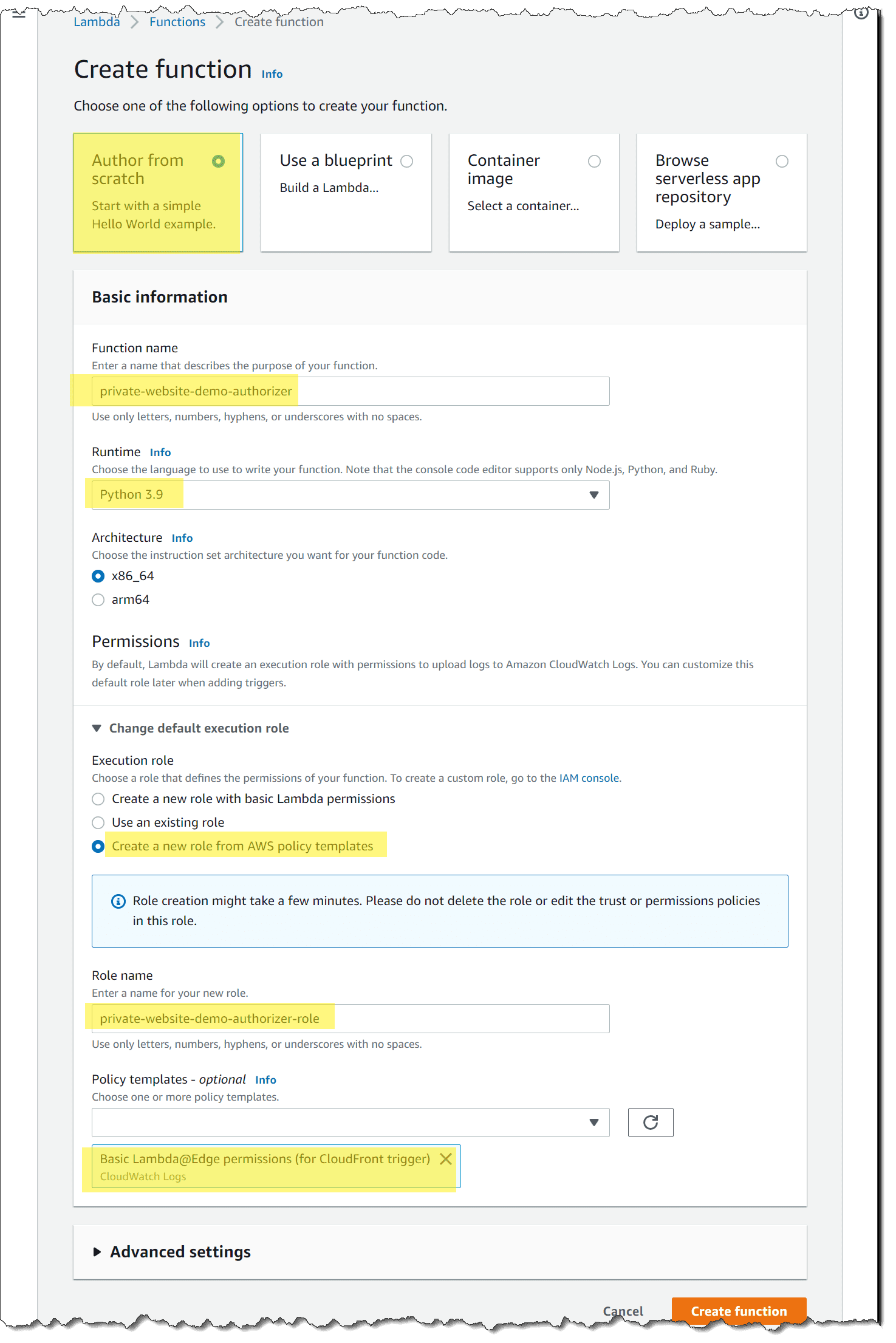 - Enter a descriptive role name, e.g., "private-website-demo-authorizer-role"
