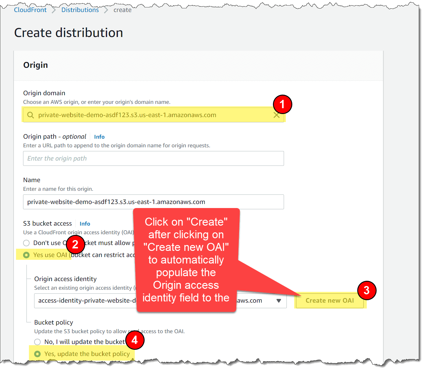 - Select "Yes use OAI (bucket can restrict access to only CloudFront)"